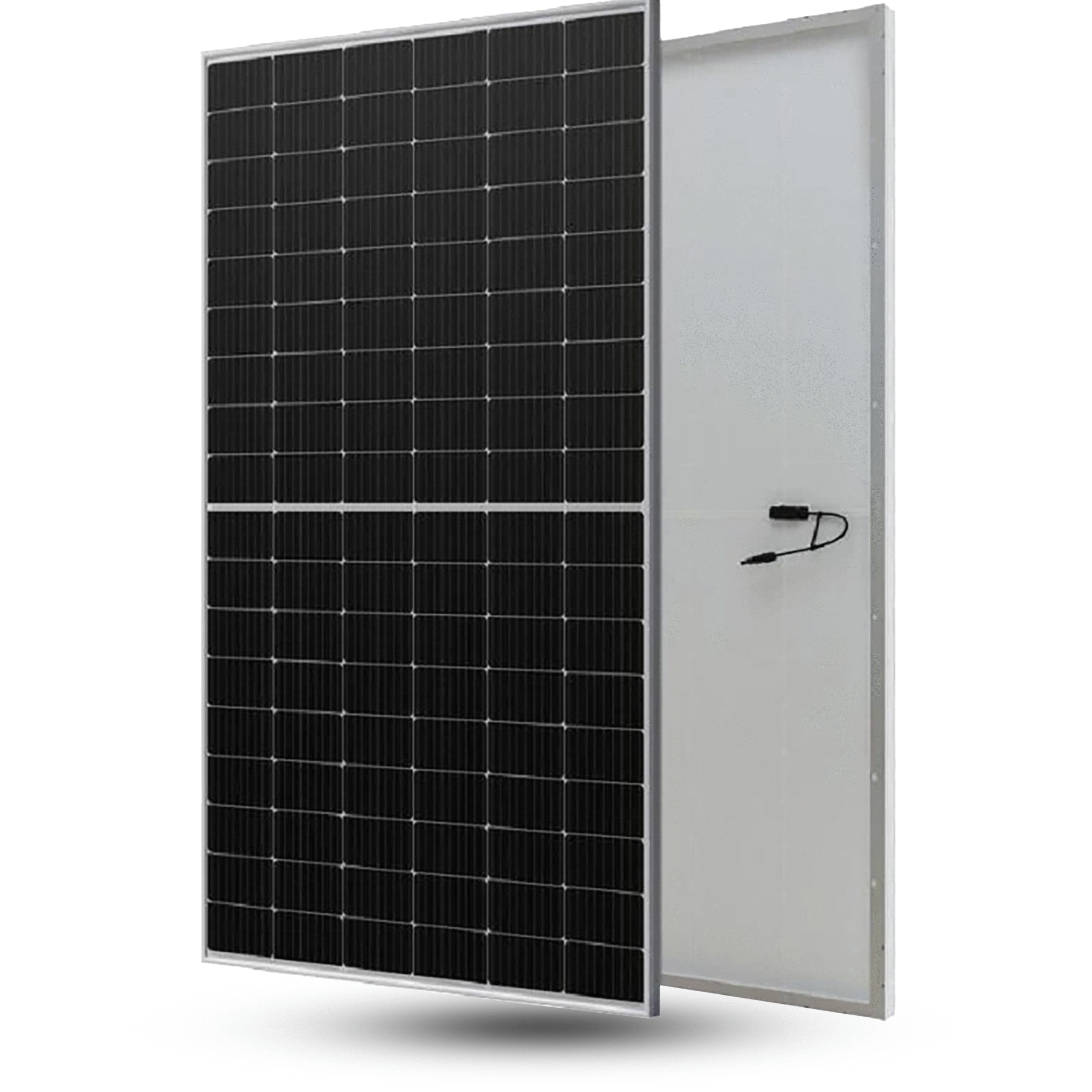 • Half-cut cell design — halves current through each cell, reducing resistive losses and improving shade tolerance